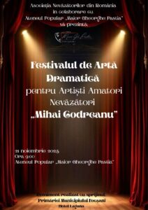 Vă invităm cu drag în data de 21 noiembrie, începând cu ora 9:00, la sala Ateneului Popular „Maior Gheorghe Pastia” din Focșani la Festivalul Național de Teatru „Mihai Codreanu” organizat de Asociația Nevăzătorilor din România în colaborare cu Ateneul Popular „Maior Gheorghe Pastia” Focșani un teatru inedit, dedicat artiștilor nevăzători, unde emoția și talentul se întâlnesc pe scenă. Vă așteptăm să descoperiți o lume plină de sensibilitate și creativitate!
