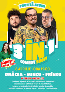 Asociatia Nevazatorilor din Romania, în colaborare cu ANR Filiala Bucuresti, vă invită la spectacolul de stand-up comedy „3 în 1”, cu Drăcea, Mincu și Frîncu, iar surpriza serii este Adelina Toma.